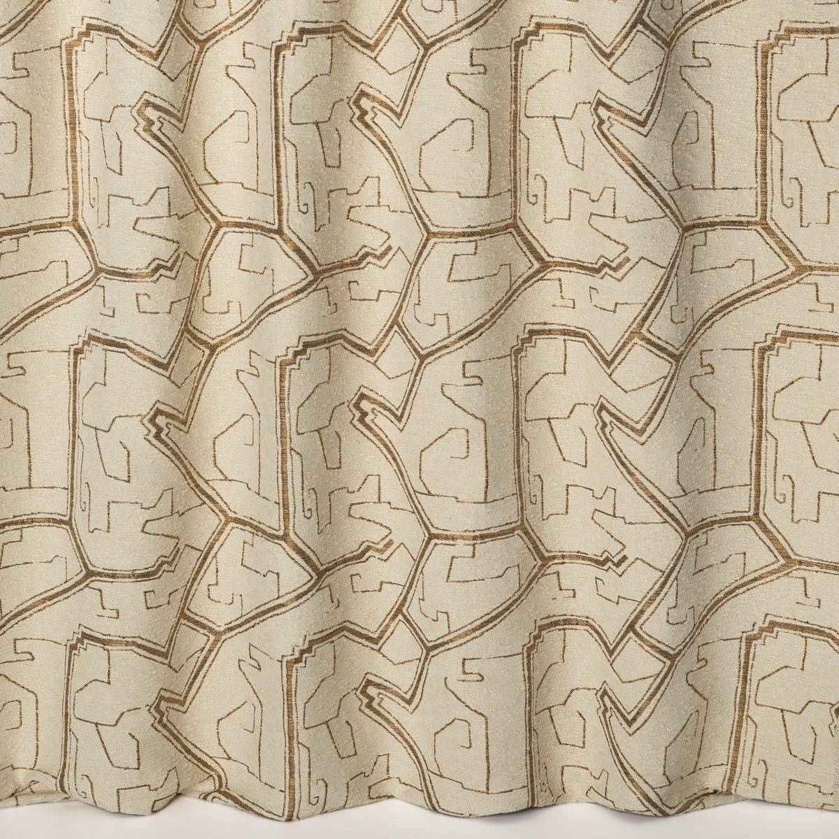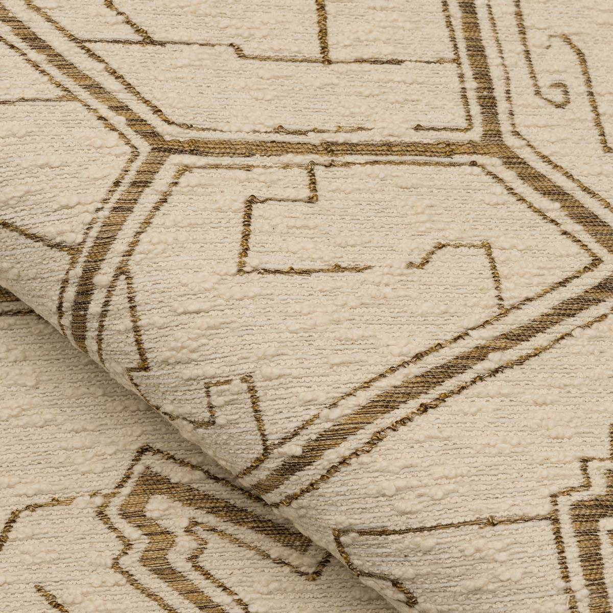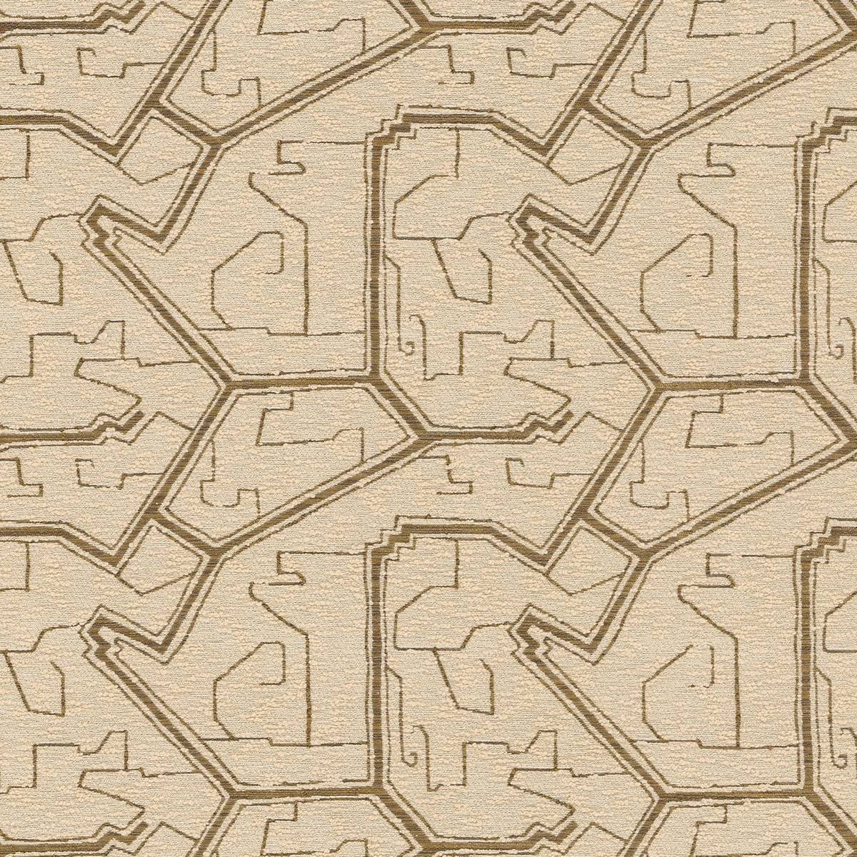 Javari ist von der psychedelischen Kunst inspiriert. Seine geometrischen Linien auf einem Hintergrund aus trockenem Bouclé schaffen ein Labyrinth aus metallisch schimmernden Linien.
