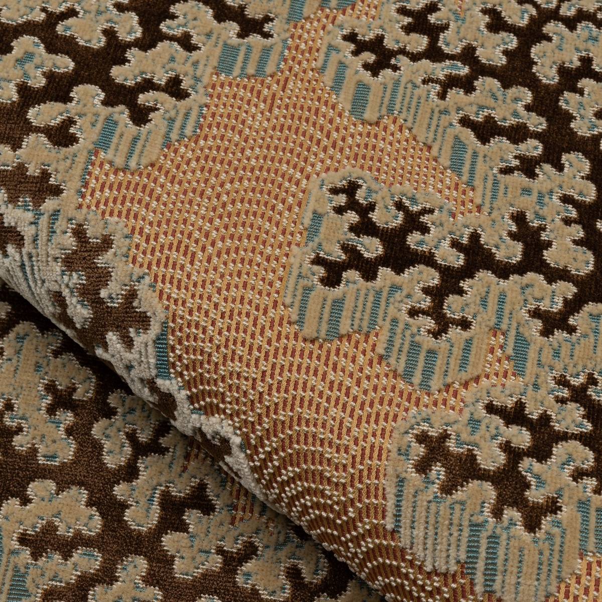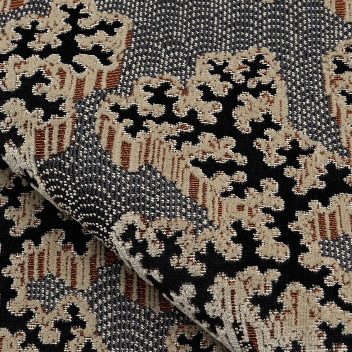 Mareva, ein edler Jacquard-Samt mit klassischen Anklängen, erinnert an ein Korallengeflecht, das mit kostbaren Perlen übersät ist. Er beweist außergewöhnliche Bezugsqualität dank der Vielfalt seiner Webarten sowie Originalität hinsichtlich des perlmuttartigen Hintergrunds und der Modernität seiner vier maskulinen Farbstellungen.