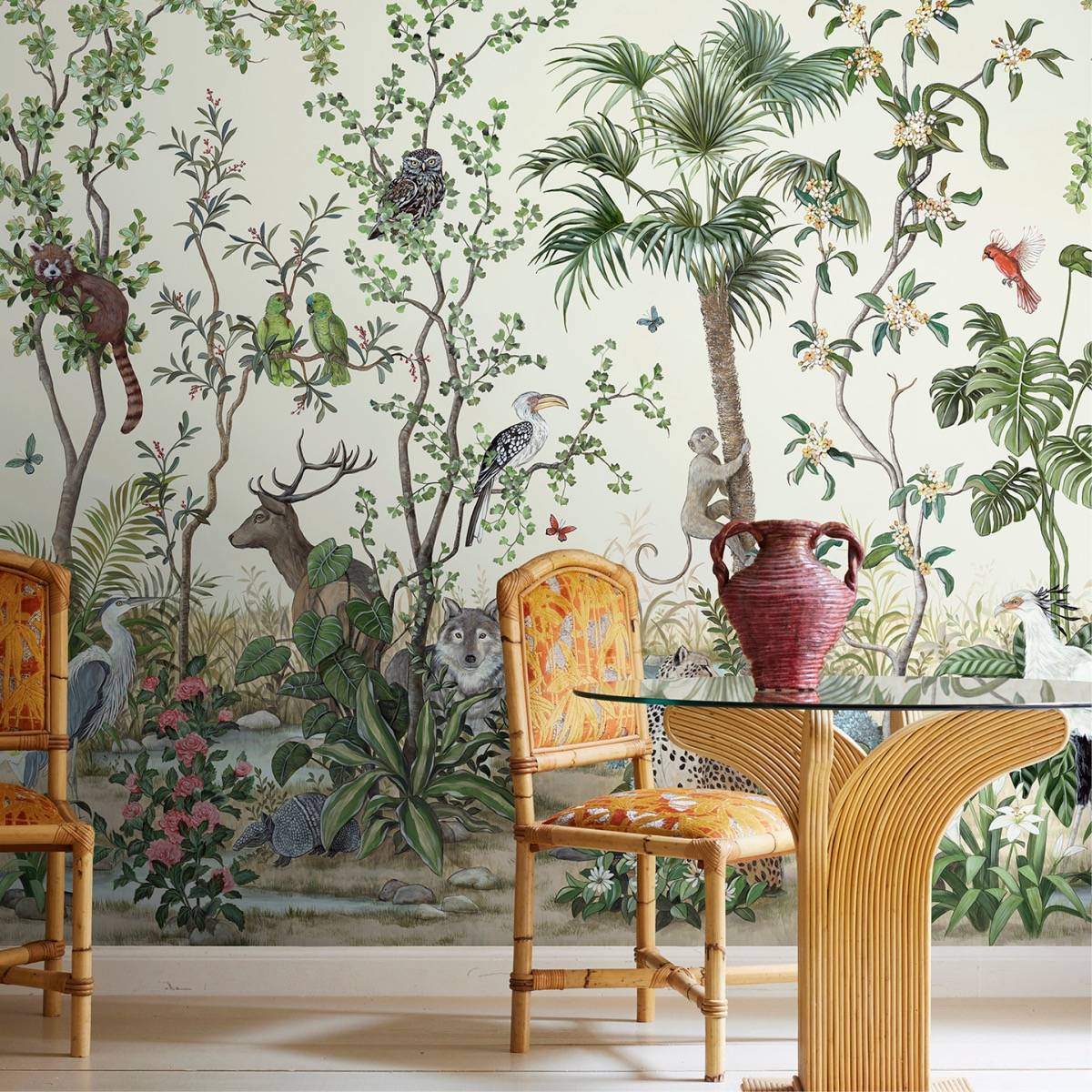 Il cuore di questo decoro è una galleria di animali. Continuando il suo approccio ai “mondi misti”, in questo piccolo angolo di paradiso Marie Hartig riunisce animali di tutte le origini, che normalmente non vivrebbero insieme, e che qui vivono fianco a fianco in armonia e tranquillità. Il lupo e l'armadillo sotto l'albero di ginkgo, il panda rosso appoggiato a uno scrittoio, che cammina vicino ai fiori di luna: sono tutti riuniti in un insieme che si armonizza come per magia. Un rolle è composto da quattro strisce di 68,5 cm x 350 cm, ovvero una panoramica completa di 274 cm x 350 cm.